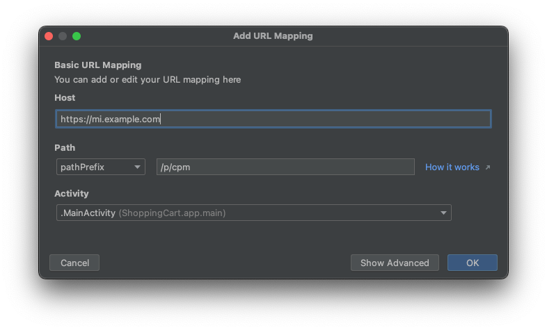</activity>Official documentation shows an overview of how to test the app links within Android Studio.