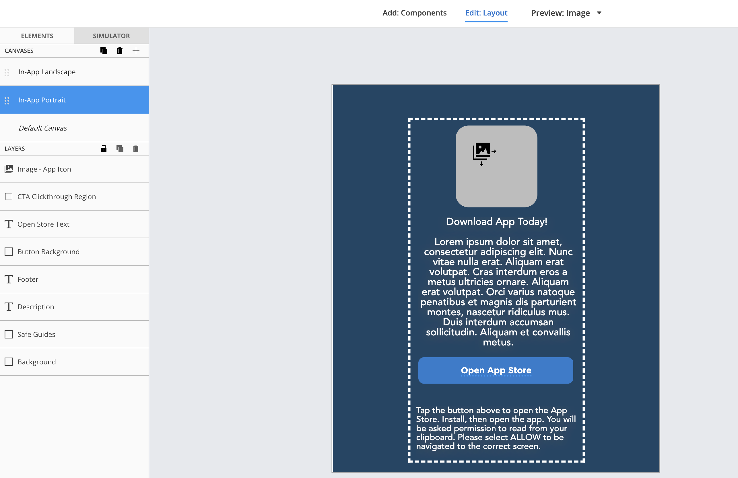 Tap the button above to open the App Store. Install, then open the app. You will be asked permission to read from your clipboard. Please select ALLOW to be navigated to the correct screen.For the clickthrough, add a shape to the canvas for your button background. Add text to the canvas and overlay it on top of your button background. Make the text dynamic, selecting Custom Property and storeName as the property. This text will update itself to show the correct text (Open App Store on iOS, and Open Play Store on Android).