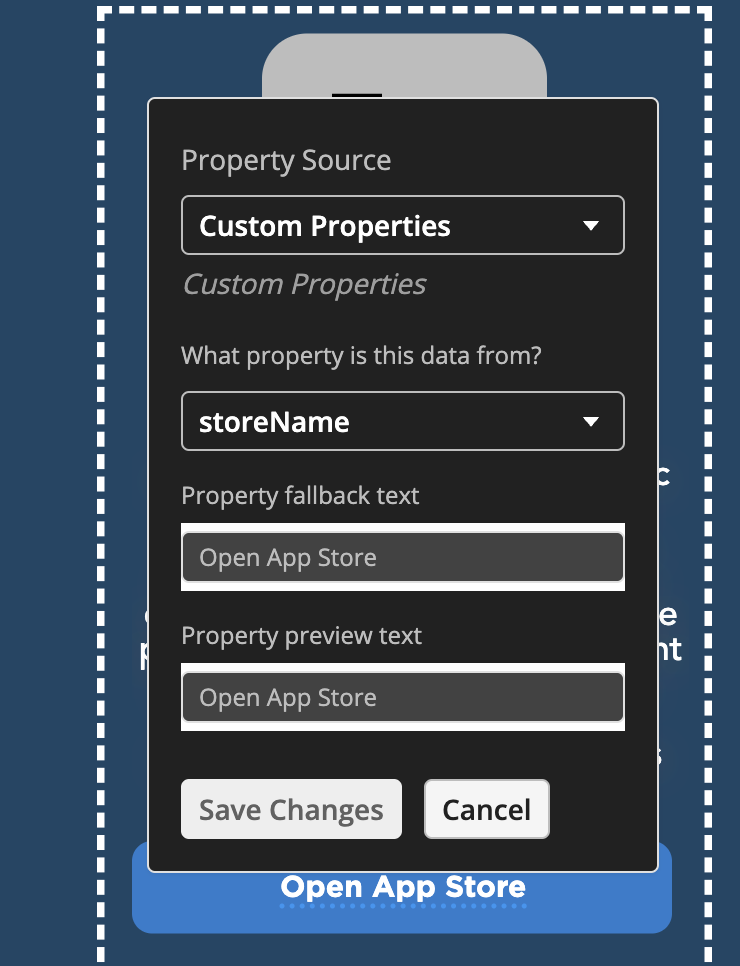 });Under the Custom Properties tab, add a new property. Set the property name to storeName and its type to Text. Add a Variable, set its source to Dynamic Fields, the key value to device, and name to device. In the code block, add this code which will allow us to detect which type of device the user is using and update the text of the button on the landing page accordingly: